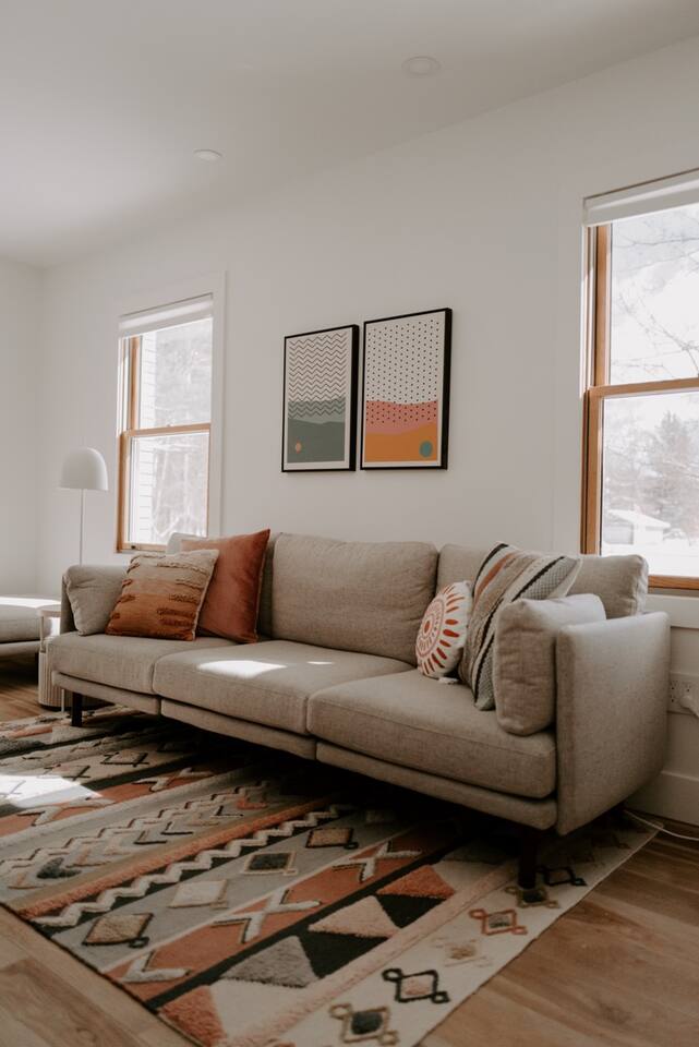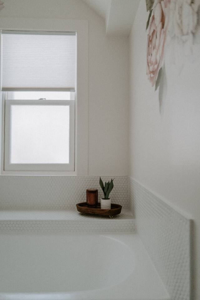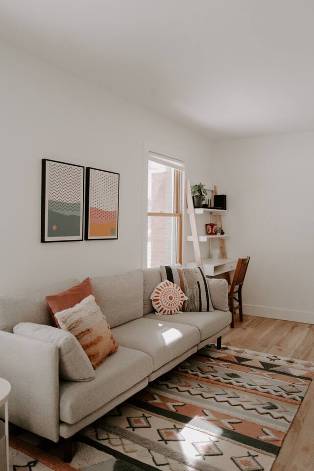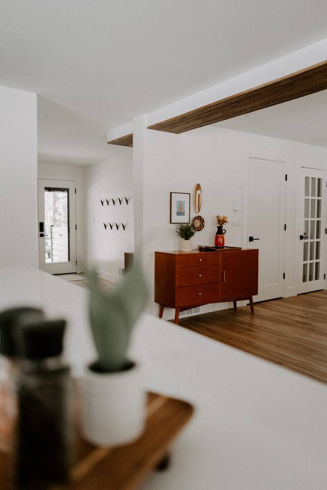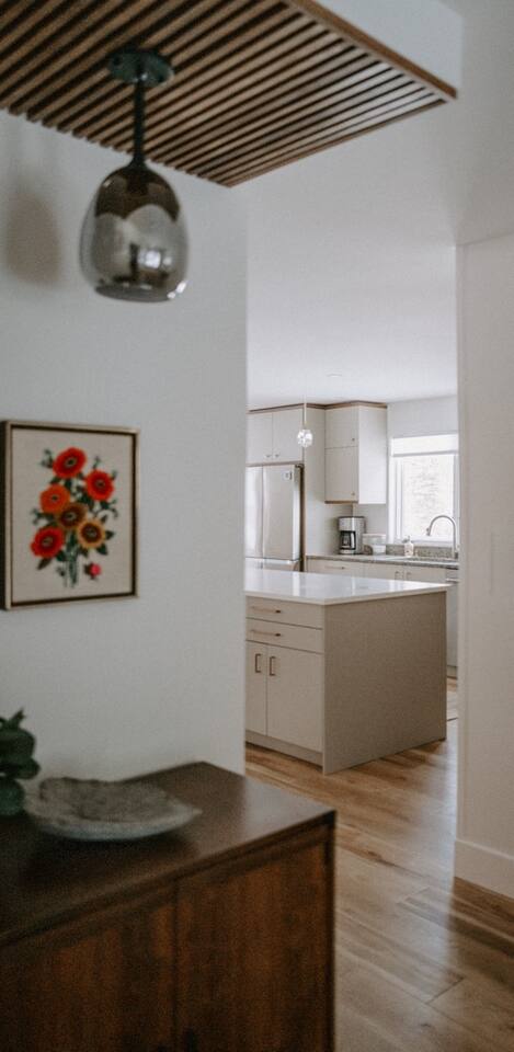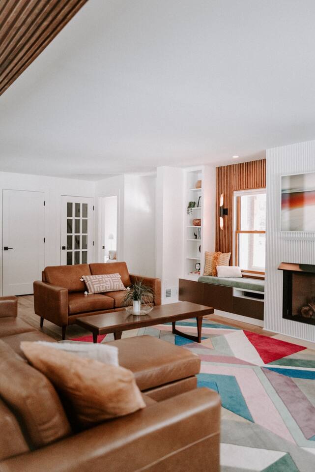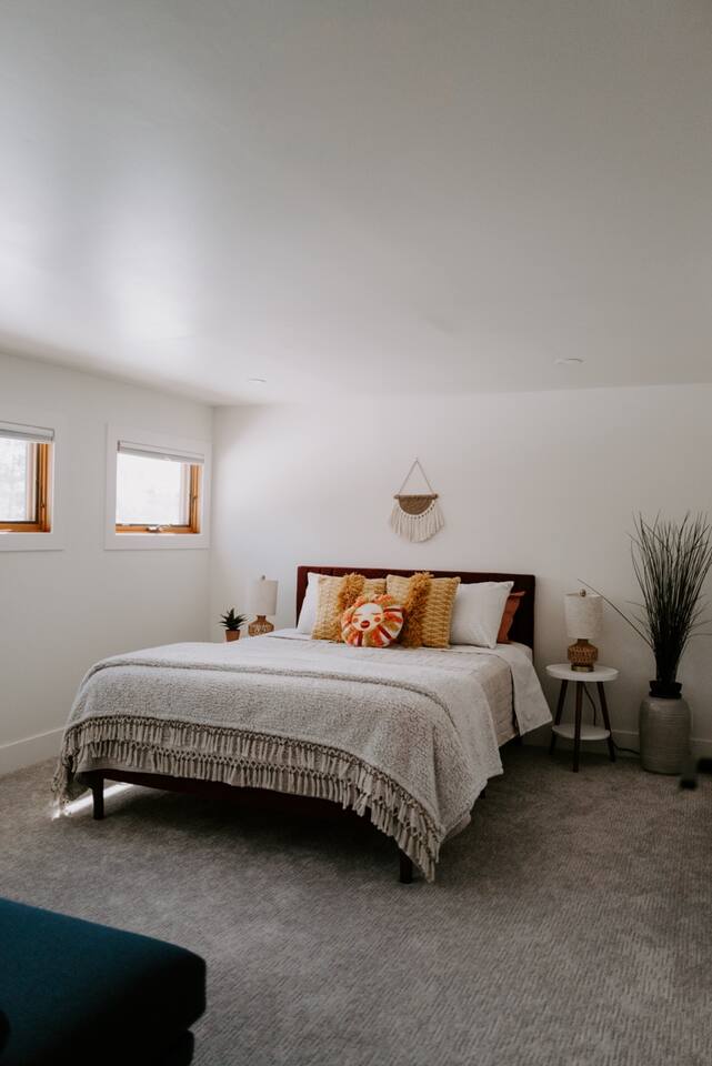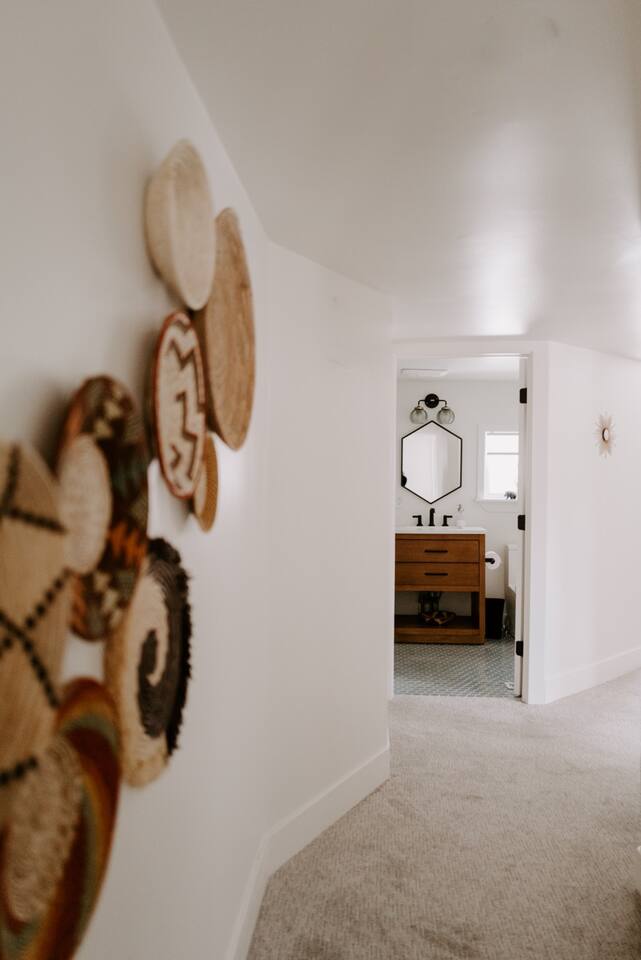This house has been thoughtfully updated to create a colorful, bright, and open space that we know you'll love. The living room, kitchen, and dining room are all on the main floor. The main floor also has a spacious laundry room, the first bathroom, and an office. The office has a TV, comfortable couch, and a play space for the kids. Just off the kitchen is a sliding glass door that will lead you to the back deck. The deck and the yard are both very spacious making it a great spot to serve dinner in the summer. After dinner head out to the fire pit to toast some marshmallows for s'mores. Up stairs you'll find all three bedrooms and two more full bathrooms. The main bedroom has a queen bed and large ensuite on one side with a walk-in shower and double vanity and another dedicated work space. The kids bedroom has an extra twin bed under each bed and extra linens to accommodate 4 people in that room if needed. The third bedroom has a queen bed with a large couch and large closet. That bedroom is directly across from the third bathroom that also offers a walk-in shower. There is a lot to love here both indoor and outdoor. We think you'll love the privacy, space, and playful design, all while being a 3 minute drive to the mall area.